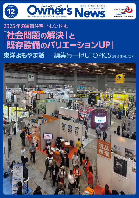 「オーナーズニュース」は、大切な不動産物件の価値を高め、安定した不動産経営の実現に役立つ様々な情報やヒント、ノウハウをご紹介する月刊誌です。 不動産経営に関する最新情報やトピックを分かりやすくお伝えいたします。